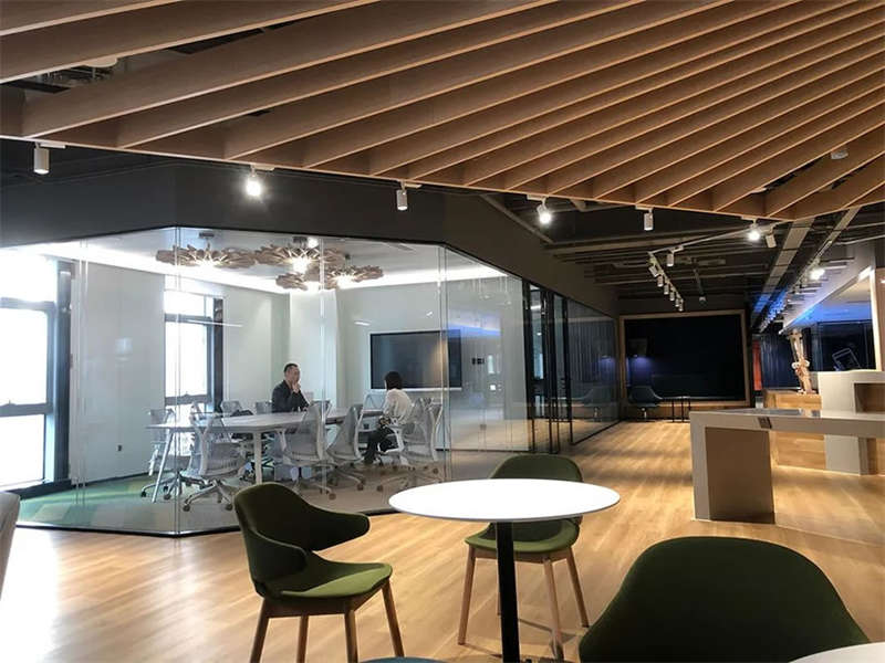 材料運用上,采用一系列天然、可再生和低排放的節能措施和材料,讓員工感受到與自然的聯系,同時提供了室內聲學舒適度。還采用了公司貿易產品——玻璃,各種玻璃的運用,充分體現了企業性質及對玻璃加工工藝的理解,既作為裝飾材料,也讓辦公區各個區域都成了產品展示區,電梯廳和門廳運用了黑色背烤漆蒙砂玻璃,電梯廳頂部運用黑色銀鏡腐蝕雕刻形成總部辦公地所在的區域地圖,其他區域也充分將壓花玻璃、幕墻玻璃、淋浴隔斷玻璃及辦公高隔玻璃等進行了充分展示。