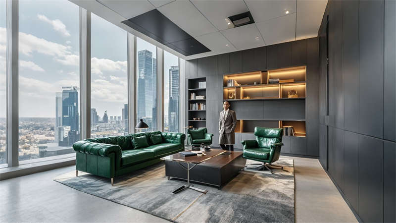 色彩體系以冷灰為主基調(diào),局部運(yùn)用墨綠、深藍(lán)跳色,通過絨面、金屬、玻璃不同材質(zhì)的反射與漫射形成豐富層次。空間規(guī)劃注重功能性延展,會(huì)議室配置可移動(dòng)隔斷系統(tǒng),實(shí)現(xiàn) 4 種空間組合形態(tài)。員工休憩區(qū)創(chuàng)新采用垂直綠植墻結(jié)合智能新風(fēng),PM2.5 實(shí)時(shí)監(jiān)測顯示系統(tǒng)保障健康環(huán)境。