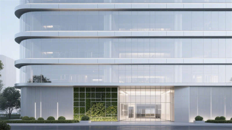 建筑外立面以流線型玻璃幕墻與啞光金屬線條勾勒科技輪廓,底部垂直綠植墻與光伏玻璃的融合,將生態(tài)可持續(xù)理念嵌入第一視覺印象。通透的挑高入口與室內(nèi)大堂形成光影聯(lián)動,淺白色大理石地面、懸浮式線性燈光與深藍色企業(yè)LOGO墻,以克制的色彩系統(tǒng)傳遞品牌調(diào)性,同時通過數(shù)字屏顯墻實現(xiàn)空間敘事動態(tài)化。