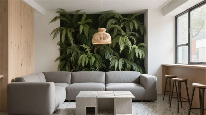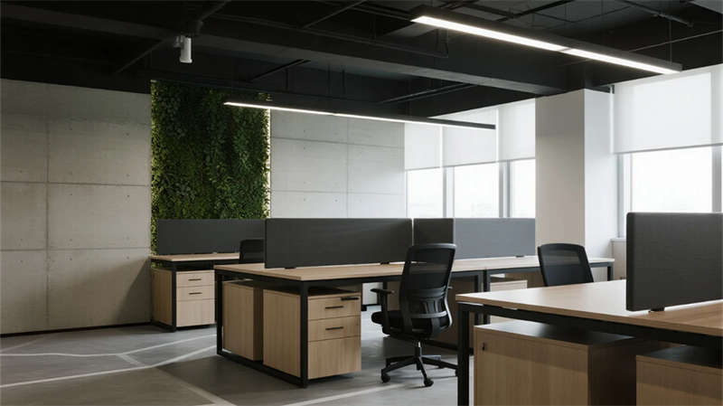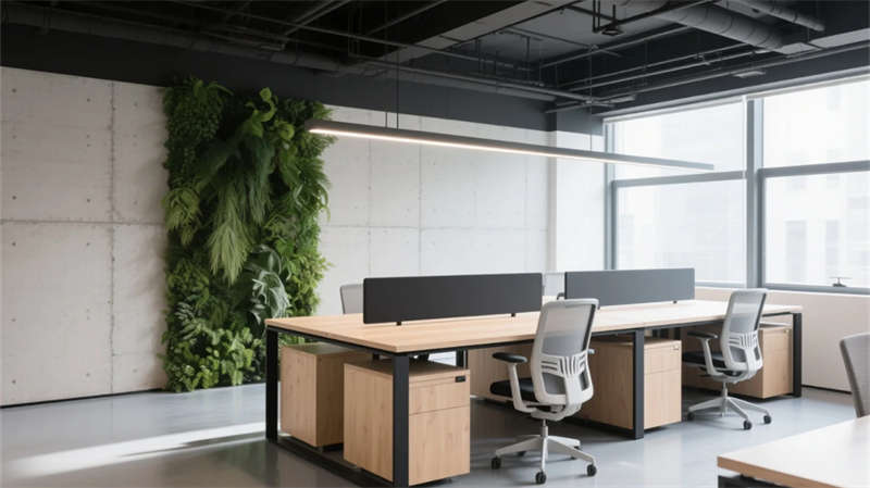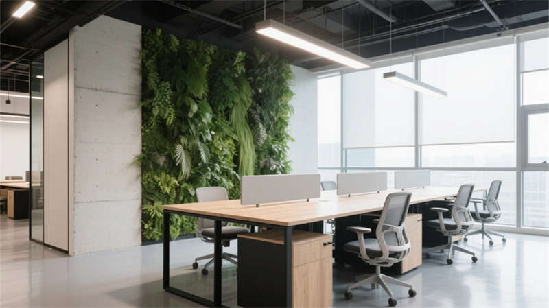 該空間以"自然共生"為脈絡,將輕工業(yè)基因與生態(tài)美學深度融合。裸露結構的天花與溫潤木元素形成張力,貫穿各區(qū)域的垂直綠植墻如同呼吸脈絡,賦予嚴謹辦公場景盎然生機。