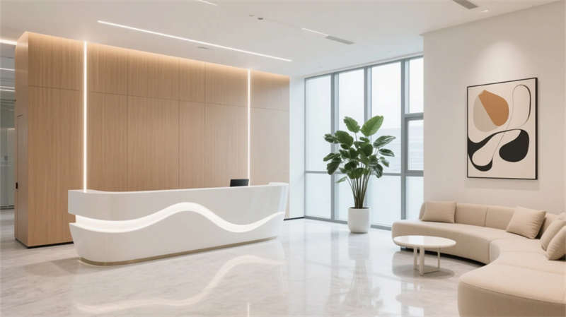 本設計以現代簡約為核心理念,通過光與自然的交融重塑辦公體驗。空間以純凈的白色與溫潤木色為主調,輔以低飽和度灰綠點綴,營造通透靜謐的氛圍。落地窗最大化引入自然光線,與線性燈帶共同勾勒出流暢的視覺韻律;綠植貫穿每個角落,從大堂的琴葉榕到辦公區的垂直花園,賦予空間呼吸感。