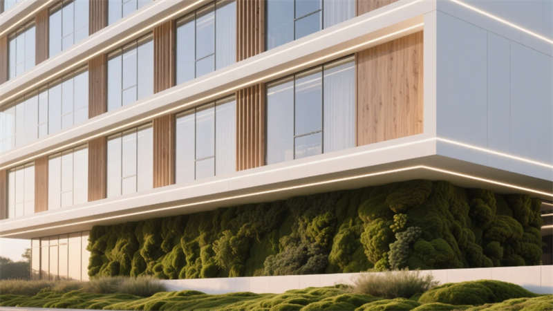 本案立足合肥科技創(chuàng)新城定位,以“自然滲透科技”為核心策略,打造7000㎡智慧辦公綜合體。外立面通過雙層呼吸式幕墻與垂直木紋格柵交織,形成動態(tài)光影濾網(wǎng),底部苔蘚景觀帶同步凈化PM2.5,實現(xiàn)建筑與巢湖生態(tài)區(qū)氣候的有機(jī)對話。
