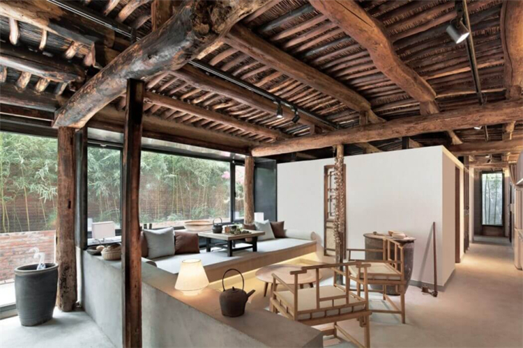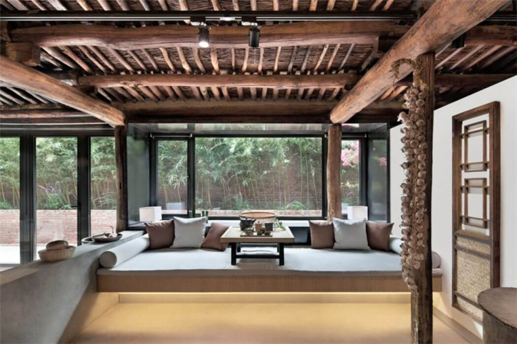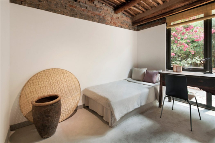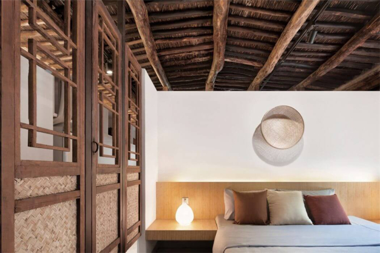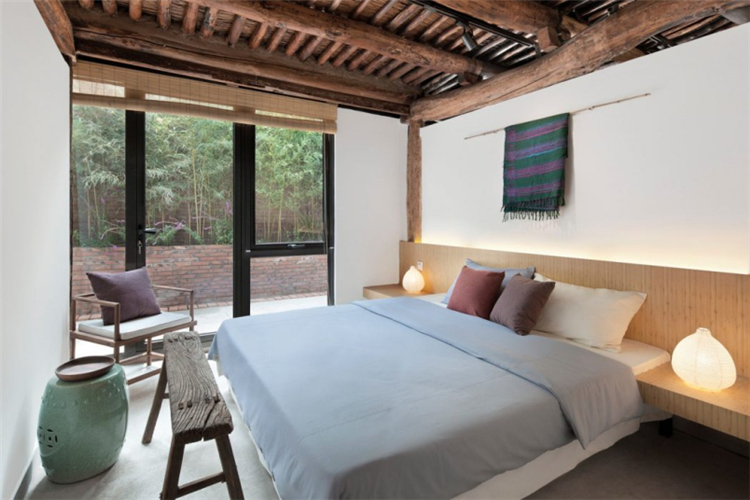 而我們在這次的民宿的功能布局方面,我們根據(jù)與居民的詳細(xì)溝通,了解他們的日常生活和習(xí)慣,進(jìn)行調(diào)整,重新組織平面圖。在我們拆除吊頂后,更多的空間被釋放,原始的木結(jié)構(gòu)和稻草覆蓋的天花板紋理終于顯露出來,講述了一個時間的故事。在現(xiàn)場勘察過程中,我們在建筑物西側(cè)和鄰近墻壁之間發(fā)現(xiàn)了一條約80厘米寬的狹窄通道。因此,我們在走廊盡頭向西側(cè)設(shè)計了一個觀景窗。在窗外,擺動的竹影有助于將室內(nèi)空間與自然環(huán)境相連。
