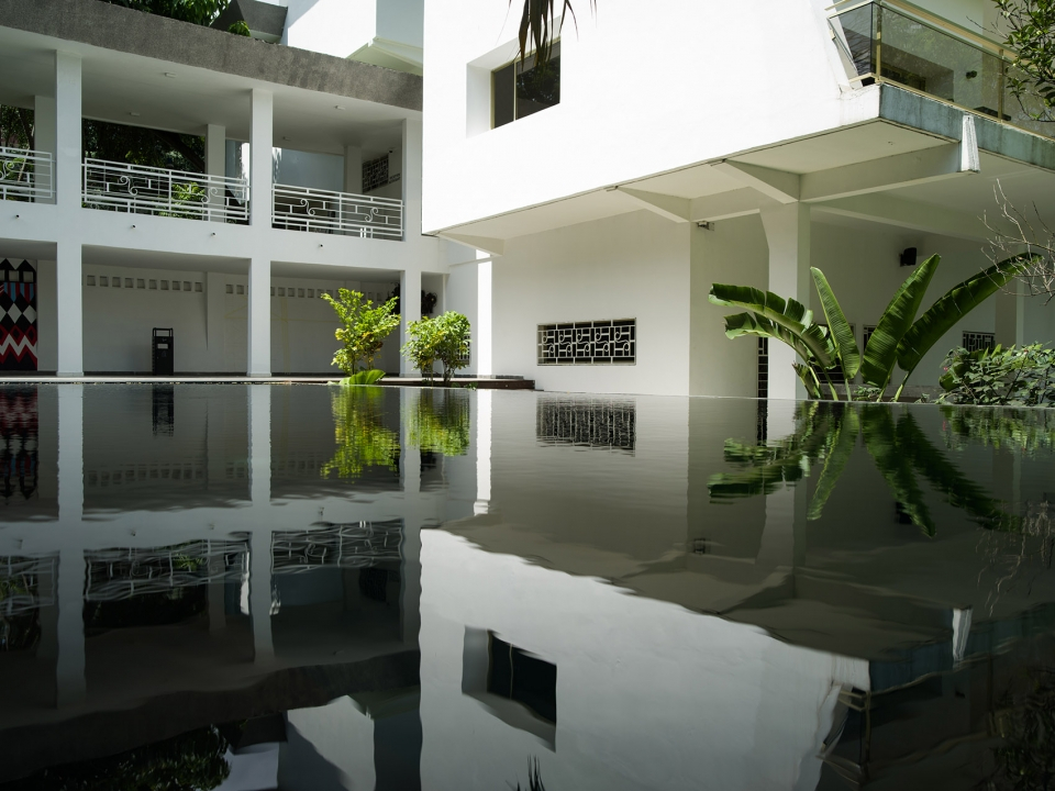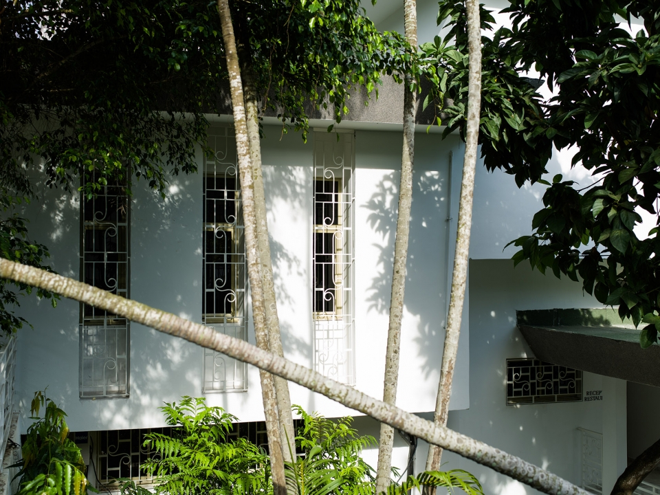 酒店外觀局部,建筑在泳池中投下倒影,部分外部視圖,池反射建筑物。健身房和養(yǎng)生區(qū)位于原建筑的廚房處,擁有良好的自然通風(fēng)以及朝向。游泳池又長(zhǎng)又窄,客人們可以在其中進(jìn)行來回往復(fù)式的游泳運(yùn)動(dòng),同時(shí)還在炎炎夏日里為客人們提供了一個(gè)消暑空間,當(dāng)?shù)貥淠镜娜~子和開花植物則為泳池空間提供了遮陰處和裝飾。