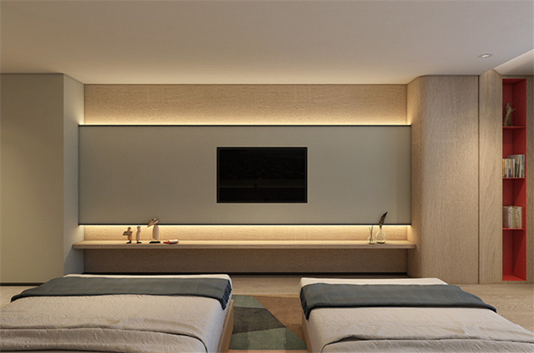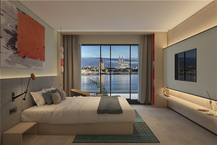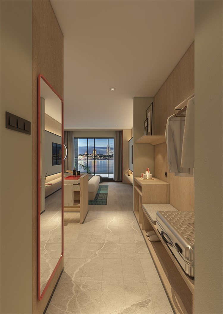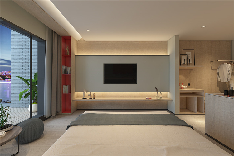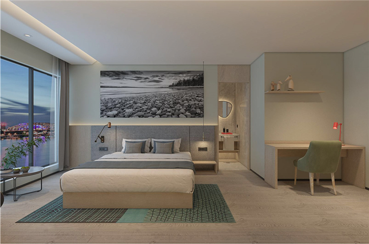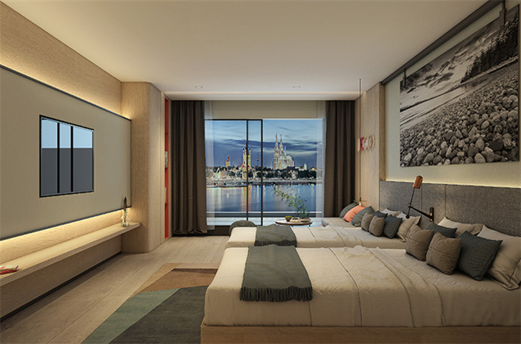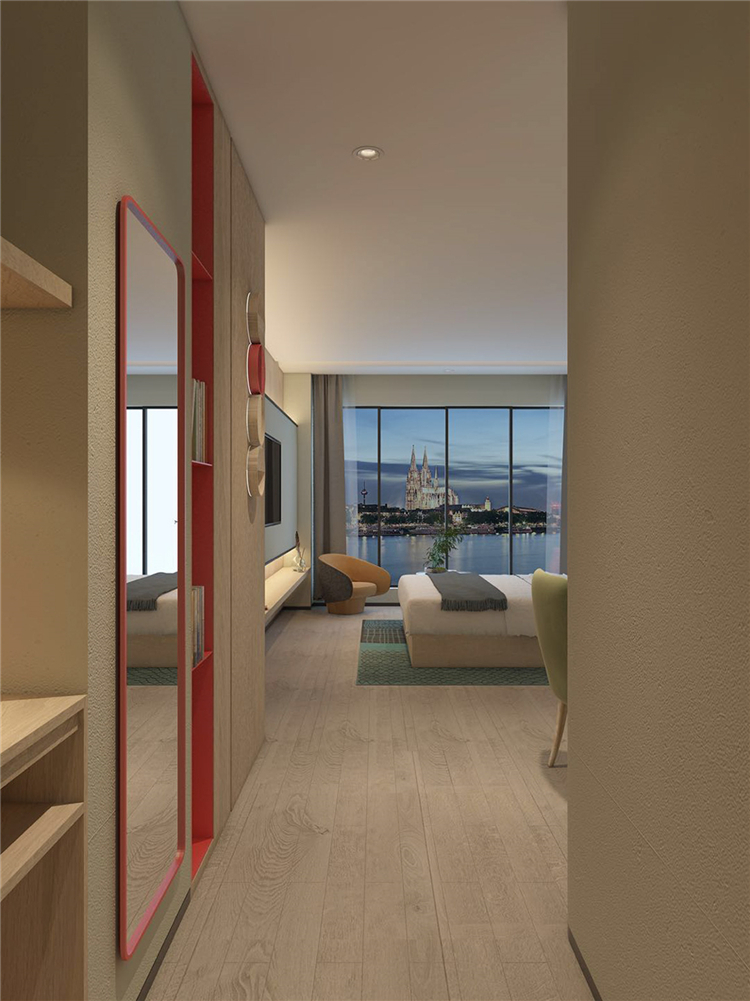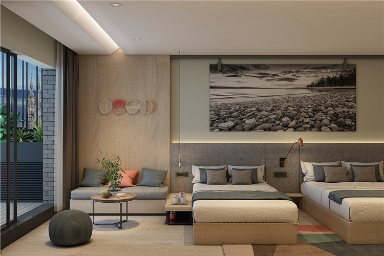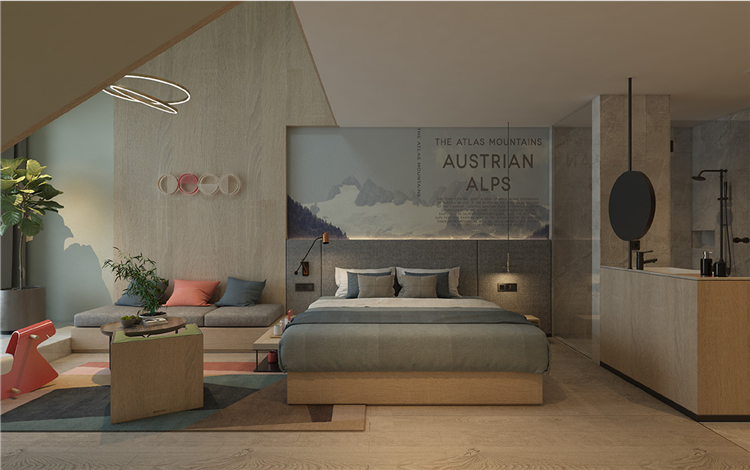 在功能的安排上人性化,為顧客帶來舒適的入住體驗(yàn)與外立面相呼應(yīng),設(shè)計(jì)師在完整的用材體系上,增加了對(duì)比性明顯的色塊,高度提升了空間的趣味性和耐看度。