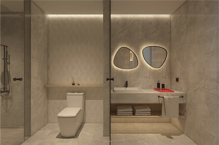設(shè)計(jì)師遵循原有的管道設(shè)計(jì),通過半堵實(shí)用的功能墻,將洗浴間和馬桶間劃分,在隱形了五金件和儲(chǔ)物歸納后,化繁為簡被得到了充分的運(yùn)用,就連回風(fēng)口也被巧妙的融入在燈帶里.