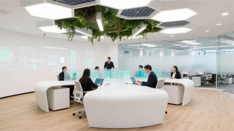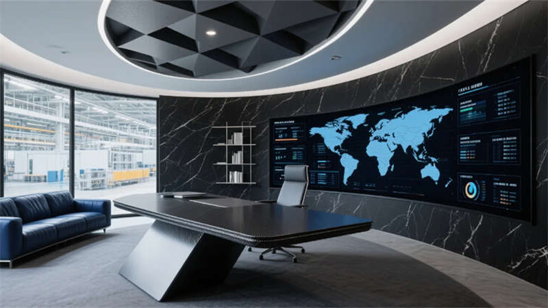 開(kāi)放式辦公區(qū)打破傳統(tǒng)壁壘,蜂窩狀工位與懸浮綠植裝置詮釋靈動(dòng)協(xié)作,透明屏幕上的數(shù)據(jù)流與玻璃隔斷投影的生產(chǎn)流程圖虛實(shí)相映。總裁空間則如懸浮的智慧中樞,弧形落地窗將車間全景化作動(dòng)態(tài)壁畫(huà),金屬與大理石的碰撞間,流淌著決策與創(chuàng)新的電流。智能倉(cāng)儲(chǔ)區(qū)立體貨架的金屬骨骼間,無(wú)人機(jī)如蜂鳥(niǎo)般掠過(guò)貨品,天光與電子標(biāo)簽的光斑在環(huán)氧地面上跳動(dòng)著數(shù)字時(shí)代的韻律。
