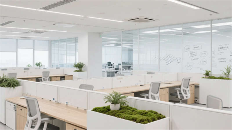 步入其中,純凈的白色與淺灰基調(diào)構(gòu)筑出開闊明亮的基底,大面積玻璃幕墻邀請陽光自由流淌。室內(nèi),垂直綠墻與蔥郁盆栽如音符般跳躍,為嚴(yán)謹(jǐn)?shù)难邪l(fā)環(huán)境注入蓬勃生機。開放辦公區(qū)強調(diào)協(xié)作與靈活,可書寫的玻璃墻面激發(fā)無限創(chuàng)意;高度自動化的核心生產(chǎn)車間則如同精密的樂章,潔凈無塵的環(huán)境、流線型的自動化設(shè)備與身著無塵服的工程師,共同演繹著尖端制造的嚴(yán)謹(jǐn)與高效。從充滿科技藝術(shù)感的展示廳、活力四射的創(chuàng)意協(xié)作區(qū),到靜謐專注的工作艙、溫馨舒適的休憩社交中心,再到專業(yè)大氣的會議空間,每一處功能區(qū)域都浸潤著統(tǒng)一的未來主義美學(xué)——簡約的線條、智能的光影、環(huán)保的材質(zhì)與克制的企業(yè)色點綴。