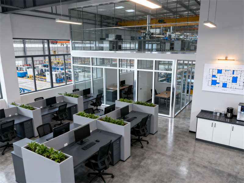 成品檢驗(yàn)區(qū)配備精密檢測(cè)儀器,合理的分區(qū)設(shè)計(jì)與適宜的照明,為精準(zhǔn)檢測(cè)提供保障。員工辦公區(qū)與休息區(qū)則兼顧實(shí)用性與舒適度,開放式辦公布局搭配獨(dú)立辦公室,休息區(qū)的沙發(fā)、餐柜等設(shè)施,為員工營造出良好的工作與放松環(huán)境。整體設(shè)計(jì)在色彩與材質(zhì)運(yùn)用上保持高度統(tǒng)一,既體現(xiàn)工業(yè)廠房的專業(yè)特質(zhì),又增添了人性化氛圍。?