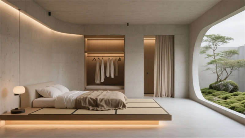 空間敘事聚焦材質(zhì)本真:微水泥地面延伸視覺縱深,懸浮式家具營(yíng)造失重趣味,線性光帶引導(dǎo)行為動(dòng)線。功能分區(qū)借由光影游戲自然過(guò)渡,下沉客廳銜接無(wú)界餐廚,榻榻米臥室推窗即見苔蘚庭院,頂樓露臺(tái)用透明邊界消融城市天際線。