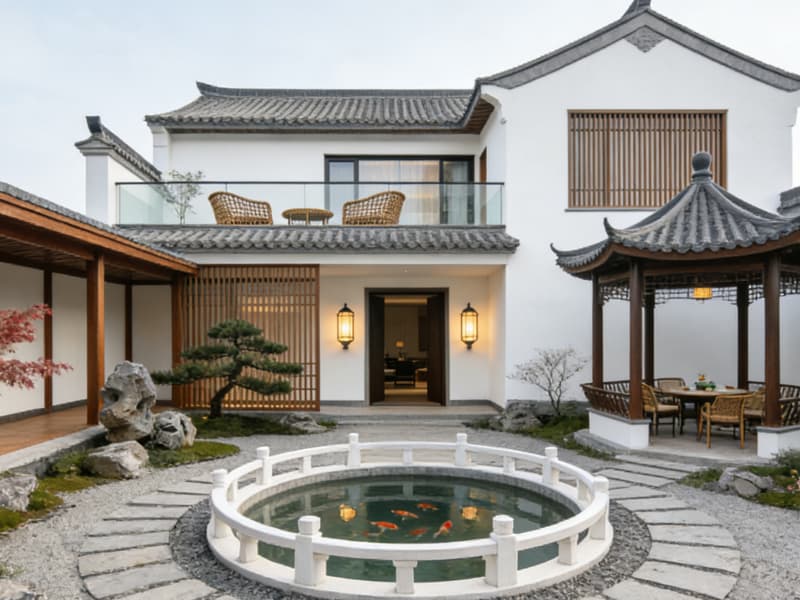 空間布局上,科學劃分公共區域與私密客房兩大板塊,公共區包含庭院、茶室、餐廳、書吧等功能區,庭院植入徽派馬頭墻元素與青石板小徑,搭配枯山水景觀與原生綠植,營造靜謐雅致的入戶氛圍;茶室采用實木茶桌與半通透屏風,墻面懸掛徽州版畫,為客人提供品茗交流的休閑空間;餐廳以暖木色為主調,配備開放式明檔廚房,兼具特色餐飲與小型聚會功能;書吧陳列安徽地域人文書籍,搭配柔軟布藝沙發,打造放松閱讀的靜謐角落。