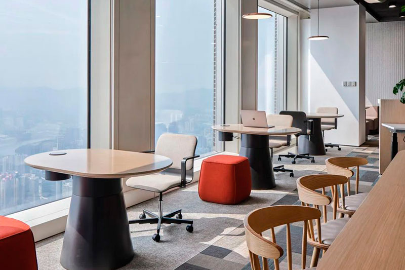 不同于投資公司的傳統形象,設計師以一個圓島吧臺和開敞的自由交流區作為前廳接待場所。大量的自然光涌入室內,明凈開闊。天花地面是圓轉流動的曲線造型,采用水磨石地面、金屬網天花、Bolon塑膠地毯等各種新環保材料,輔以色彩鮮麗的多功能家具組合、大型LED屏和隨處點綴的綠植,呈現出年輕、現代、科技而又充滿能量的生命氣息。