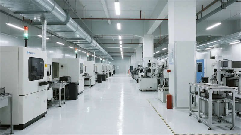 內(nèi)部空間延續(xù)"少即是多"哲學(xué):生產(chǎn)車(chē)間以銀白為主調(diào),設(shè)備管線規(guī)整排布于頂棚,環(huán)氧地坪反射線性燈光,營(yíng)造科技感十足的無(wú)塵環(huán)境;辦公區(qū)突破傳統(tǒng)隔斷,玻璃幕墻引入外部景觀,綠植墻自然劃分區(qū)域,形成通透開(kāi)放的協(xié)作場(chǎng)域。