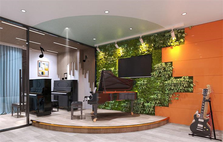 前廳不變的情況下,logo背景墻色調偏重,所以運用了色彩降噪,添加了一些偏冷色調,不僅能夠提升整個空間的舒適感,還能給孩子一個安全、放松的空間。結合了logo的主色調,再進行色彩搭配可以形成歡快、親切、活潑的色彩氛圍。與此同時還設置了也增加了兩間鋼琴室,提高了空間利用率。大廳玻璃教室內墻面貼了吸音板,一方面體現(xiàn)機構在音樂上的專業(yè)性,另一方面就是讓空間的隔音效果做到最佳,讓孩子在學習的時候不受干擾,能夠安靜的學習。