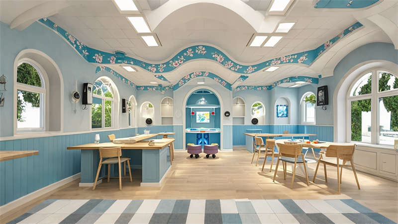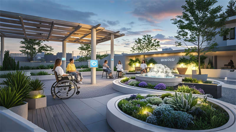 重點(diǎn)區(qū)域采用防滑橡膠地板、圓角處理家具、緊急呼叫裝置等 35 項適老細(xì)節(jié),照明系統(tǒng)采用 4000K 暖白光搭配智能調(diào)光。醫(yī)療區(qū)設(shè)置獨(dú)立新風(fēng)機(jī)房,活動區(qū)配置體感互動設(shè)備,戶外花園集成霧森降溫和夜光導(dǎo)航系統(tǒng),打造安全、舒適、智能的現(xiàn)代養(yǎng)老空間。